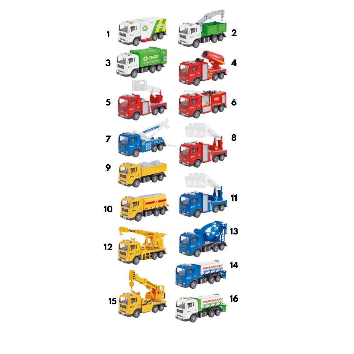 Disponibile in 16 modelli diversi, tra cui camion della spazzatura, gru, camion dei pompieri, betoniere, camion cisterna e molto altro ancora. Tutti i veicoli sono realizzati in plastica sicura e colorata, perfetti per stimolare la vista e la fantasia.