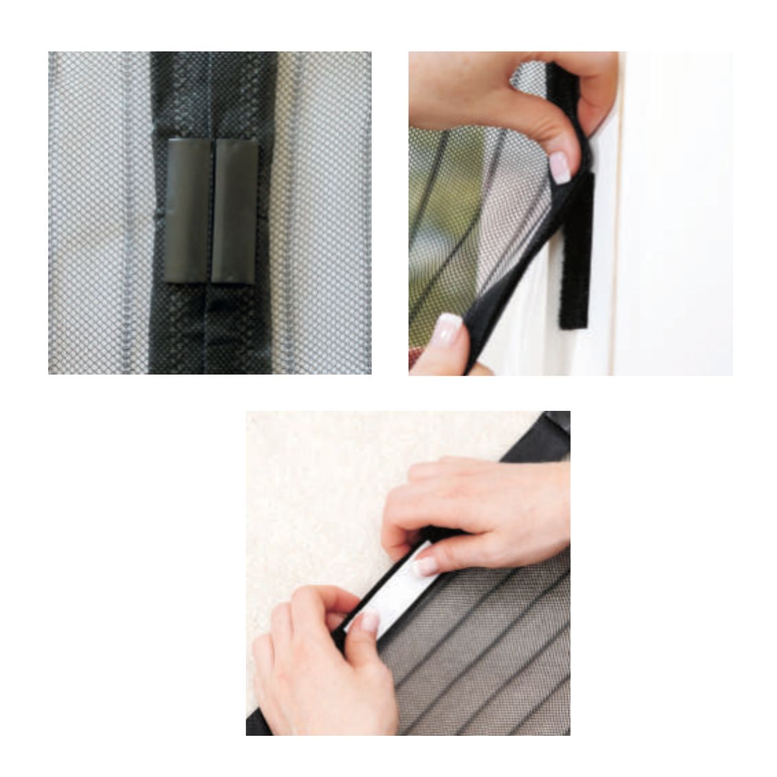 La zanzariera si applica al perimetro del vano porta utilizzando il nastro adesivo in dotazione, senza necessità di utensili o forature. I clips magnetici esterni completano il fissaggio e garantiscono la tenuta sui quattro lati. Prima dell'applicazione è consigliabile pulire accuratamente la superficie su cui verrà applicato il nastro adesivo per assicurare una migliore aderenza.