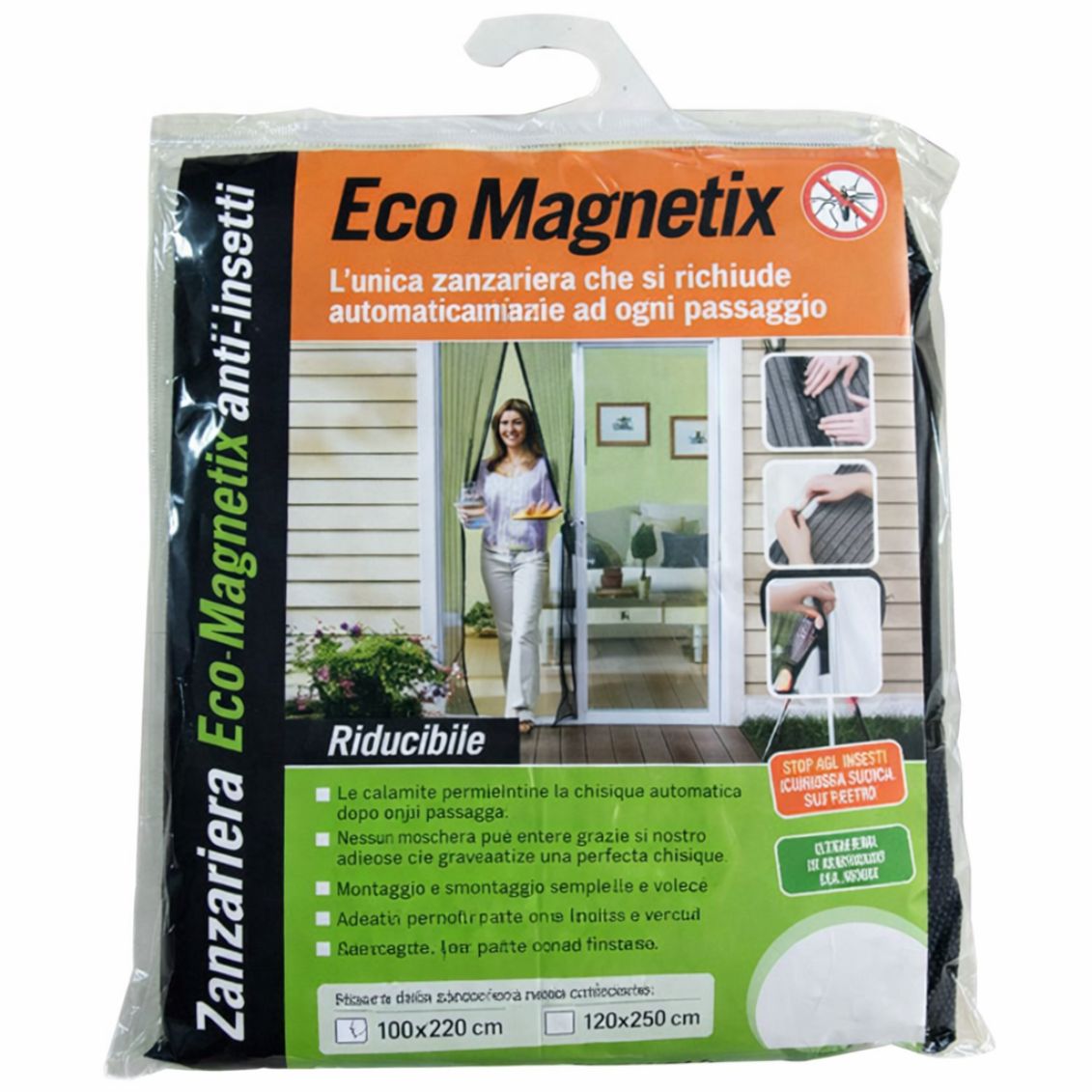 La Zanzariera Magnetica Eco Magnetix 100x220 cm Nero è una zanzariera in poliestere per porte con chiusura magnetica automatica, fissaggio senza forature tramite nastro adesivo e clips magnetici, stop cimici. Riducibile in altezza e in larghezza. Codice EAN: 8027914007552.